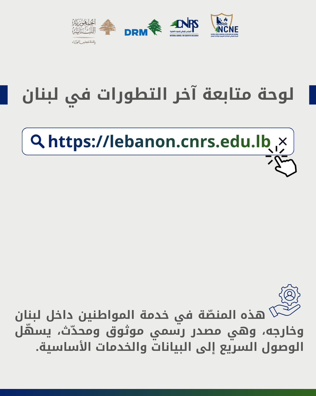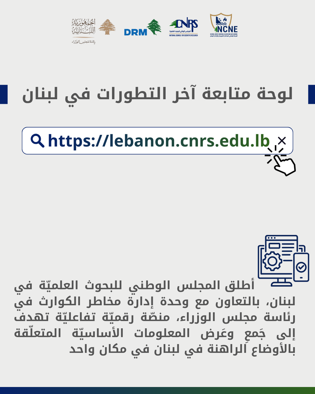 أطلق المجلس الوطني للبحوث العلميّة في لبنان، بالتعاون مع وحدة إدارة مخاطر الكوارث في رئاسة مجلس الوزراء، منصّة رقميّة تفاعليّة تهدف إلى جَمعِ وعَرض المعلومات الأساسيّة المتعلّقة بالأوضاع الراهنة في لبنان في مكان واحد
